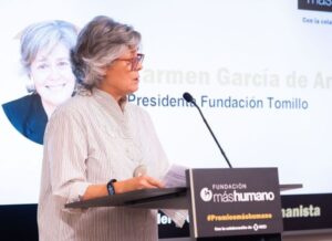 Por su parte Carmen García de Andrés, Licenciada en Ciencias Económicas y Empresariales por la Universidad Pontificia de Comillas, ICADE. En 2006 se integra en la Fundación Tomillo donde es presidenta. También es miembro de varios patronatos y ha sido miembro del Consejo de Telefónica. Como presidenta de Fundación Tomillo, ha impulsado iniciativas que destacan por su impacto significativo en la lucha contra la exclusión social a través de la educación, la formación y el desarrollo del potencial de jóvenes en situación de dificultad. La ejemplaridad y capacidad de liderazgo, el enfoque innovador, el impacto de sus acciones en el desarrollo de las personas a las que van dirigidas y la sostenibilidad en el tiempo han sido los criterios de evaluación por parte del jurado. Además, de Carmen García se ha valorado el ser pionera en el desarrollo de la inserción laboral de personas vulnerables, impulsando su empleabilidad y emprendimiento, contribuyendo para ello desde la Fundación que preside con una gran aportación metodológica.